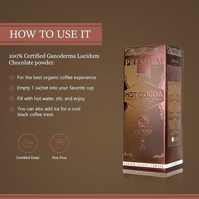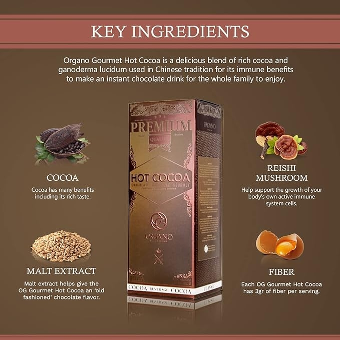 - ORGANO’s Gourmet Hot Cocoa provides a comforting warm and silky instant chocolate drink enhanced with Ganoderma lucidum that is Rich in flavor and antioxidants. It can be enjoyed hot or iced for a decadent cocoa treat.