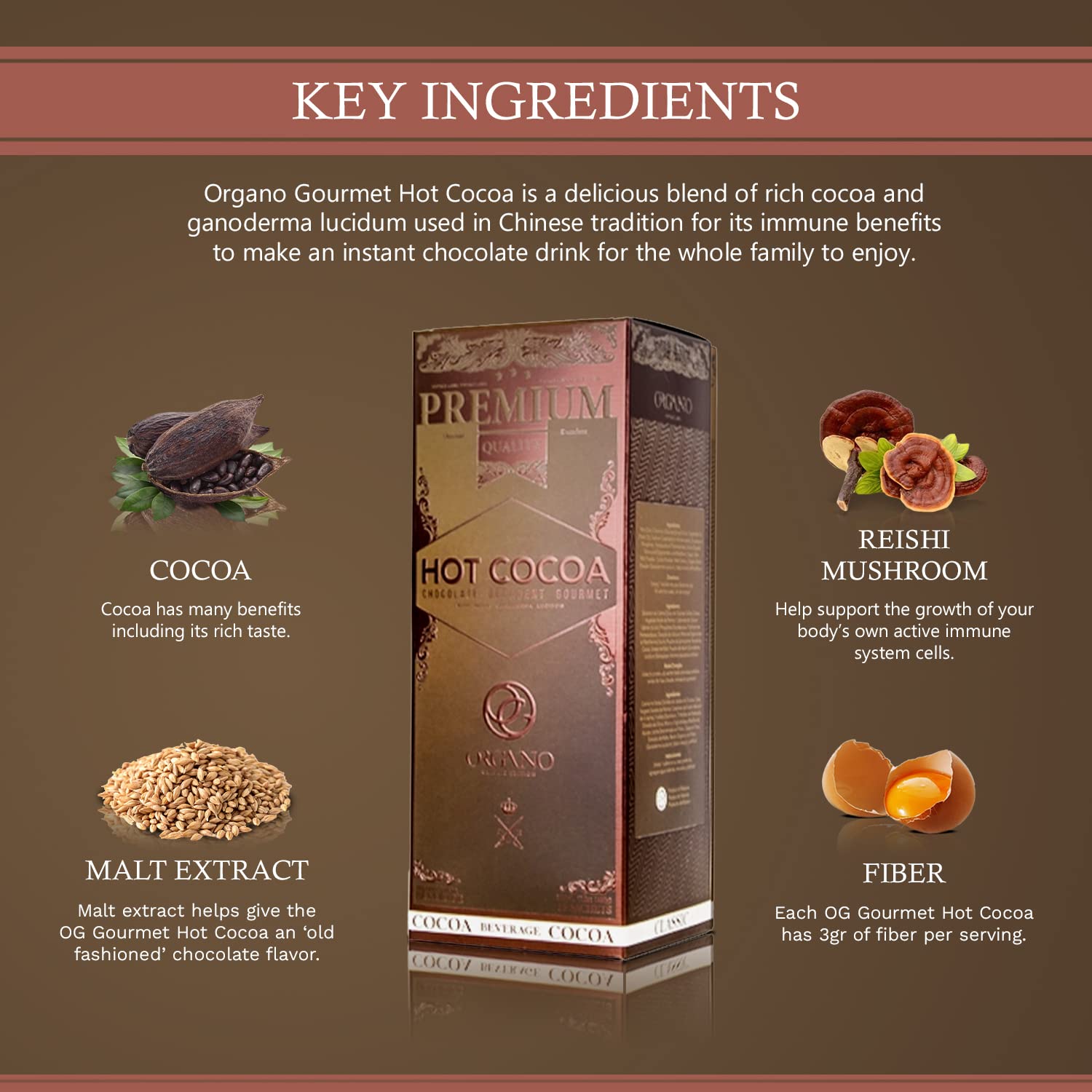 - Organo Gourmet Hot Cocoa is a delicious blend of rich cocoa and ganoderma lucidum used in Chinese tradition for its immune benefits to make an instant chocolate drink for the whole family to enjoy.